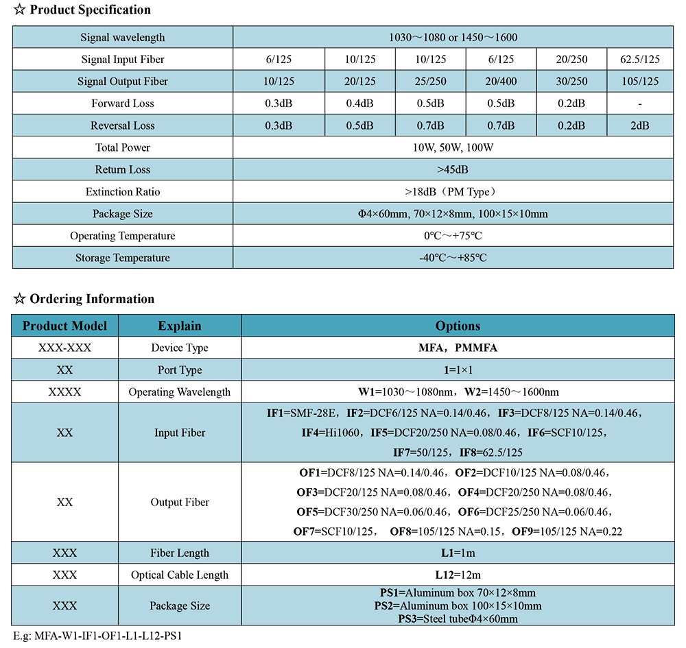 The fiber mode field adapter (MFA) produced by OSCOM has high output power, high conversion efficiency, stable and reliable. It is suitable for medium and high power fiber amplifier and medium and high power fiber laser.
